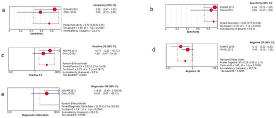 Sensitivity (a), specificity (b), positive likelihood ratio (c), negative likelihood ratio (d), and diagnostic odd ratio (e) for abscess detection.