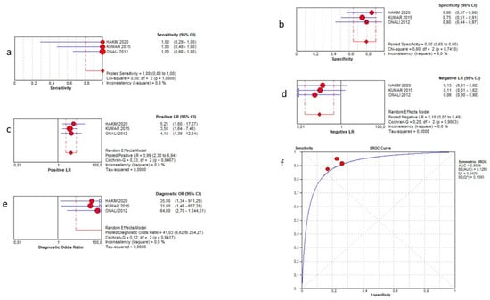- Zamora, J.; Abraira, V.; Muriel, A.; Khan, K.; Coomarasamy, A. Meta-DiSc: A software for meta-analysis of test accuracy data. BMC Med. Res. Methodology 2006, 6, 31. [Google Scholar] [CrossRef]