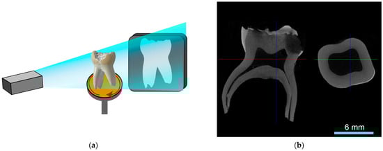 (a) In μ-CT measurements, probes are rotated. The electron beam is attenuated by the sample and presented on a detector panel. (b) Exemplary μ-CT reconstruction of a primary molar in coronal and transverse plane (scale of 6 mm). The right section of the image shows the transverse plane indicated by the red line.