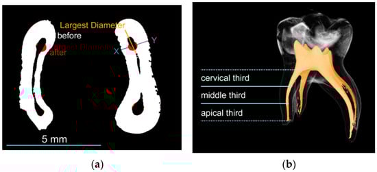 The measurement of the μ-CT analysis was performed by second operators (J.S., J.S.T.). The primary molars were scanned using X-ray micro-computed tomography (μ-CT, SkyScan 1272, version 1.5.1.0, Bruker, Kontich, Belgium; Figure 1a,b) before and after root canal preparation. For measurement, each root canal was divided into cervical, middle and apical thirds (Figure 2a).