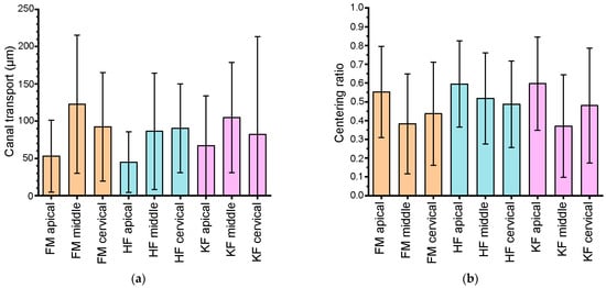 Figure 3 displays the canal transport (a) and centering ratio (b) for all used instruments after root canal preparation. Whereas FM and KF revealed the highest canal transport in the middle root canal, HF showed the highest value in the cervical root canal. The centering ratio presented for all three types of files in the apical root was the third-highest amount.