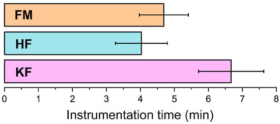 Instrumentation time is shorter with FM and HF than with the KF. The KF has to be changed during the procedure, which takes more time. Previous studies on primary teeth have shown similar results [7,15].