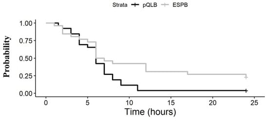 Total cumulative doses of morphine delivered through the PCA system during the first 24 h from performance of the analgesic block were not significantly different between the two groups (4 (IQR 1–12) mg in the ESPB group vs. 4 (IQR 3–6) mg in the pQLB group; p = 0.897). The need for rescue doses of morphine was lower in the ESPB group compared to the pQLB group (hazard ratio of 0.51, 95% CI (0.27 to 0.95), p = 0.030). In fact, at 24 h, 20 patients (77%) in the ESPB group compared to 25 (96%) in the pQLB group (risk ratio of 0.80 (95% CI: 0.63 to 0.99), p = 0.025) required rescue doses of morphine for inadequate analgesia. Among patients requiring rescue morphine, time to the first dose of morphine was not statistically different between the two groups, with a median time of 6 (IQR 3–9) h in the ESPB group compared to 6 (IQR 4–7) hours in the pQLB group (p = 0.898) (Figure 1).