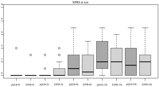 Boxplot showing the distribution of NPRS values at rest for the two groups at different points, t0 = immediately after block execution, 2, 6, 12 and 24 h = after performance of the block. Abbreviations—NPRS: Numeric Pain Rating Scale. ESPB: Erector Spinae Plane Block. pQLB: posterior Quadratus Lumborum Block.