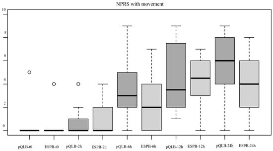 Boxplot showing the distribution of NPRS values with movement between the two groups at different points, t0 = immediately after block execution, 2, 6, 12 and 24 h = after performance of the block. Abbreviations—NPRS: Numeric Pain Rating Scale. ESPB: Erector Spinae Plane Block. pQLB: posterior Quadratus Lumborum Block.