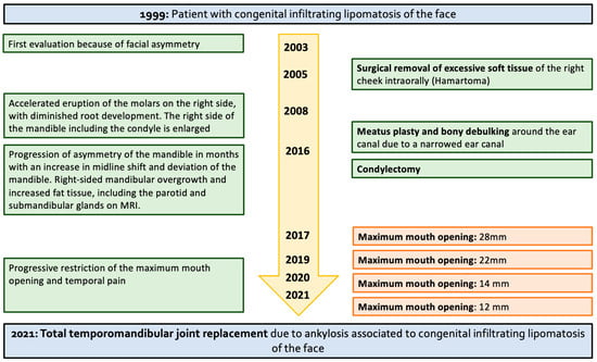 - Sahai, S.; Rajan, S.; Singh, N.; Arora, H. Congenital infiltrating lipomatosis of the face with exophytic temporomandibular joint ankylosis: A case report and review of the literature. Dentomaxillofacial Radiol. 2013, 42, 16128745. [Google Scholar] [CrossRef] [PubMed]