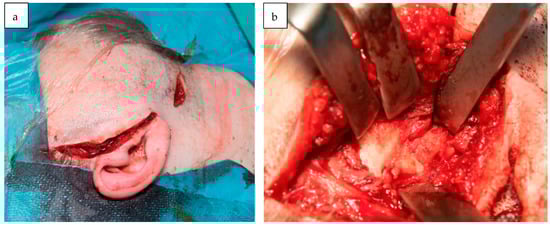 The surgical approach to TMJ reconstruction using a pre-auricular and peri-angular mandibular incision (a). An intraoperative image illustrating the partial bony ankylosis of the TMJ (b).