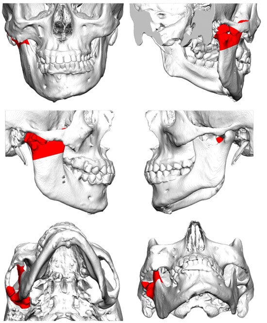 The resected bone (red) of the mandibular fossa, articular tubercle, coronoid process, and condyloid process.