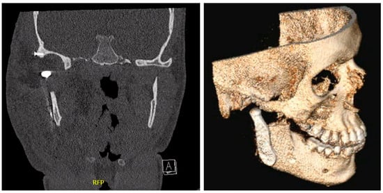 Four years later, the patient presented with progressive restriction of the maximum mouth opening (MMO). On intra-oral examination, a bony density was palpable on the right zygoma. A computed tomography (CT) scan showed a minimal increase of the neo-condyle and marked osseous hypertrophy of the coronoid process, forming a neo-articulation with the anterior part of the zygomatic arch, and no radiological signs of osteoma or osteochondroma. After two months, the patient presented with temporal facial pain and a further decrease in mouth opening. Due to the progressive restriction of the mouth opening (12 mm), surgical intervention was indicated. Considering the risk of scar tissue development and new CIL-F overgrowth after gap-arthroplasty, temporomandibular joint reconstruction was chosen as the treatment of choice. The primary purpose of the surgery was to improve the patient’s mouth opening, relieve facial pain, and maintain a stable occlusion.