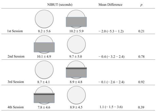 A total of 26 participants were included in the study. The mean ± SD age was 30.3 ± 5.9 years (Range: 23–43). 15 (57.6%) participants were female. The mean ± SD NIBUT for all measurements without a face mask was 8.9 ± 3.7 s, with a face mask was 10.2 ± 4.1, and with a tape-secured face mask was 8.4 ± 3.8. There were no statistically significant differences in NIBUT values between the measurements without a face mask, with a face mask or with a tape-secured face mask (p > 0.05) as shown in Table 1. The mean NIBUT value for each of the measuring sessions is presented in Figure 1 and no significant differences in NIBUT were observed in any of the four sessions.