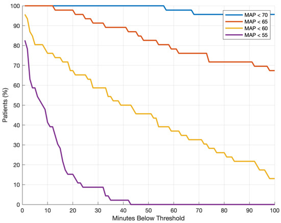 Proportion of patients with hypotension (MAP below a given threshold) and cumulative minutes under threshold. MAP: mean arterial pressure.