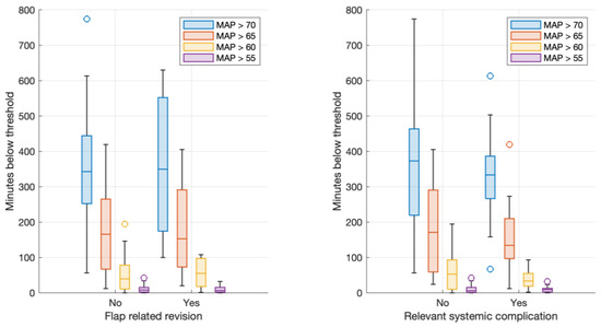 Boxplots of minutes below thresholds and flap-related revision (left). Boxplots of minutes below thresholds and systemic complications (right).