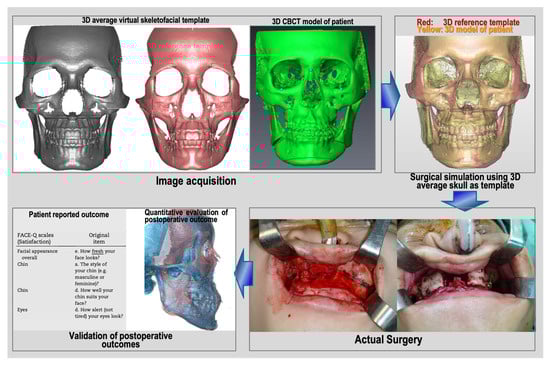 This study included 30 Taiwanese patients (18 females, 12 males) undergoing two-jaw orthognathic surgery (OGS) with surgical simulation using the average skull template, from August 2021 to July 2022. The patients, aged 22 to 38 years, presented with class III malocclusion, facial asymmetry, concave profile, and other related issues. All of them underwent cone beam computed tomography (CBCT) scans for surgical simulation. The procedures were performed by the same orthodontist and surgeon. Exclusions comprised severe deformities, prior orthognathic surgery, and facial trauma. Institutional Review Board approval was obtained (Chang Gung Medical Foundation IRB 202002305B0), and the participants provided informed consent. The methodology for constructing the 3D craniofacial model and 3D average skull-based surgical planning was outlined in a previous publication []. The study’s flowchart (Figure 1) details four stages: 3D image acquisition, surgical simulation, actual surgery, and post-operative outcome validation.