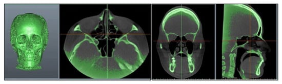 Participants underwent pre-surgical CBCT scans using the KaVo ORTHOPANTOMOGRAPH™ OP 3D Vision X-ray system (DEXIS™, Quakertown, PA, USA) with a low-dose protocol. The scans, performed 2 weeks pre-surgery, used 120 kVp, a voxel size of 0.4 mm × 0.4 mm × 0.4 mm, 26-s scan time, and an 11 cm × 23 cm × 17.3 cm field of view. Head orientation ensured that the Frankfort horizontal plane was parallel to the ground. The patients were instructed to avoid swallowing, to keep their mouths closed, and maintain a centric occlusion bite. The resulting DICOM-format image data, with 0.4 mm slice thickness, were processed in Materialise ProPlan CMF 3.0 (Leuven, Belgium) to reconstruct and analyze 3D bone and soft tissue models (Figure 2). Threshold values of 300–400 HU and 800–900 HU distinguished the hard and soft tissues, respectively. All CBCT data were stored in the Chang Gung Craniofacial Research Center’s database.