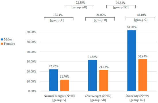 Liver fibrosis, as determined by FibroScan-determined transient elastography, was found in 57 patients with T2DM (34.76%), being more prevalent in men than women (45.12% vs. 24.39%, p = 0.011). According to the data presented in Figure 1, liver fibrosis occurred significantly more often among overweight and diabesity patients compared to those with normal body weight (p = 0.002).