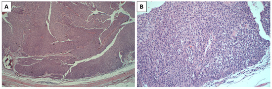High-grade urothelial carcinoma: the neoplasm completely filled the lumen of the ureter ((A)—hematoxylin eosin 4×; (B)—hematoxylin eosin 20×).