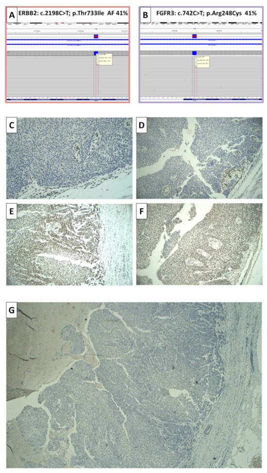 Next-generation sequencing results: ERBB2 mutation (A) and FGFR3 mutation (B). Immunohistochemical staining of mismatch repair proteins: There was an absence of the MSH2 ((C)—20×) and MSH6 ((D)—20×) proteins, with internal positive control of lymphocytes. MLH1 ((E)—10×) and PMS2 ((F)—10×) proteins are normally present. PD-L1 immunostaining (clone 22C3) was completely negative in tumoral cells and in inflammatory cells ((G)—4×).