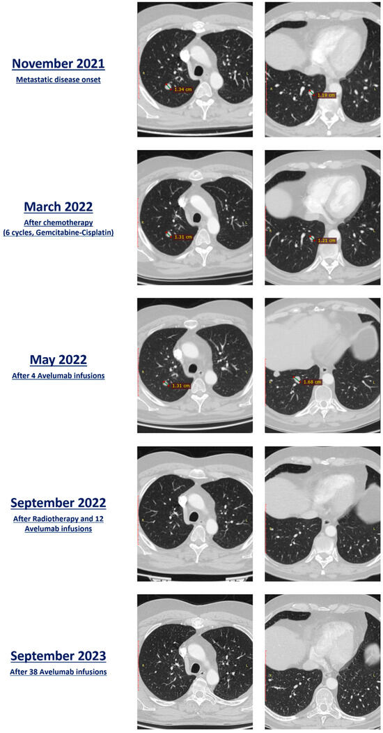 Lung metastasis evolution (target lesions): before the start of therapy (November 2021), after 6 cycles of chemotherapy (March 2022), after 4 administrations of avelumab (May 2022), after radiotherapy and 12 cycles of avelumab (September 2022), and after 38 cycles of avelumab (September 2023).