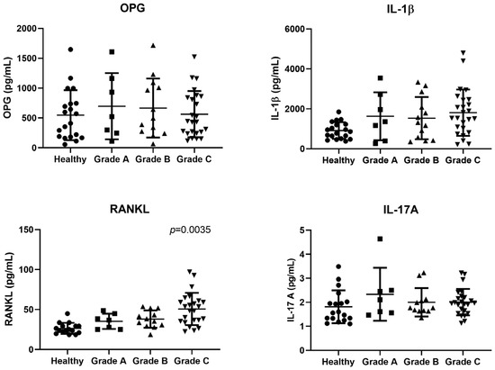 Similarly, we noticed that the grade C periodontitis patients presented mean IL-1β values higher than those of the grade B and grade A patients, albeit without reaching statistical significance. The mean IL-17A values did not show statistically significant differences between the different grades, although it stands out that the IL-17A levels were slightly increased in the grade C patients. While we did not find any statistically significant differences in any of the three periodontitis grades in terms of the OPG level, the latter showed a tendency to decrease with the disease progression, being higher in the grade A patients than in the grade C patients.