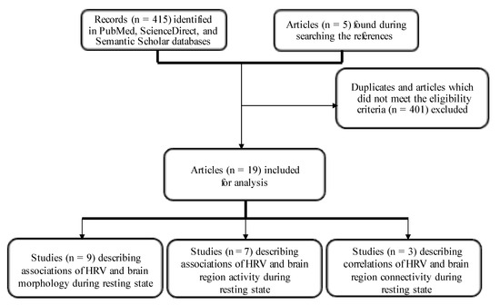 PubMed, Semantic Scholar and ScienceDirect databases were explored using the following keywords: (“heart rate variability” OR HRV) AND (MRI OR “magnetic resonance”) AND (brain OR “brain function” OR “brain structure”) AND (rest OR “resting state”).” Records found using these keywords were then evaluated to determine if they fit criteria for inclusion in the current review. The initial search identified 415 results. After removing duplicates, the initial eligibility assessment was based on titles and abstracts. Then, the full texts that fit the inclusion criteria were screened for the eligibility criteria. Two authors (P.S.M. and C.Z.) independently examined the full texts to confirm the suitability of the studies for the following qualitative synthesis. During the whole process, disagreements were resolved by consulting other co-authors (P.T.M. and O.A.) and supervisor (P.K.S.). The last search was conducted on 15 August 2022.