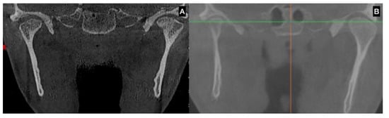 CBCT of the same subject in sagittal view. (A) left condyle in normal growth and (B) right condyle with hyperplastic growth involving neck and ramus of the same side of the mandible. The progressive asymmetry will move all the sides involved in the abnormal growth of the condyle.