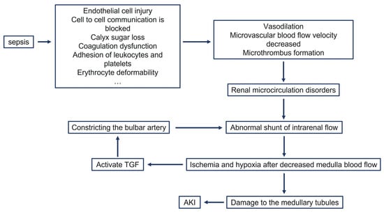 Hypoxia in the medulla also exacerbates renal injury by involving the tubuloglomerular feedback mechanism (TGF). Hypoxia in the thick ascending branch of the Henle collaterals can lead to decreased production of adenosine triphosphate, which decreases sodium reabsorption, activates TGF, and reduces the glomerular filtration rate by constricting the afferent small arteries, which again triggers a vicious cycle of medullary hypoperfusion and hypoxia [31]. In conclusion, abnormal renal medullary perfusion due to microcirculatory impairment, tissue ischemia and hypoxia, and reaggravation of medullary hypoxia by TGF in sepsis are the main pathological mechanisms for the development of AKI associated with sepsis (Figure 1), and renal medullary hypoxia can be corrected clinically by improving microcirculation, thereby reversing renal impairment.