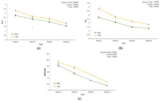 Using a linear mixed model, we determined whether there was a difference in back and leg VAS scores between the two groups after surgery and whether there was a difference in drug use (Table 4, Figure 3). The back VAS scores in the BESS and microscopic ULBD groups decreased to 1.558 and 1.871, respectively, at 12 months after surgery. There was a statistically-significant difference in the improvement of lower back pain between the two groups over time. The leg VAS scores in the BESS and microscopic ULBD groups decreased to 1.323 and 1.809, respectively, at 12 months after surgery. There was a statistically-significant difference in leg pain improvement between the two groups over time. Average pregabalin drug use decreased to 15.282 mg and 27.745 mg in the BESS and microscopic ULBD groups, respectively, at 12 months after surgery. The amount of drug used also showed a statistically-significant difference between the two groups over time.