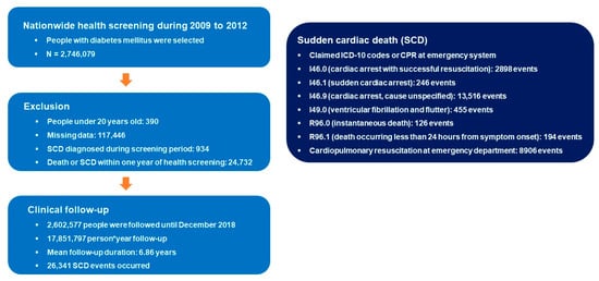 Among people who underwent nationwide health screening during 2009 to 2012, those with a prior diagnosis of DM were enrolled. Only people with type 2 DM was screened and people with type 1 DM was not included in this study. Those with prior diagnosis of SCD and age < 20 years at health screening were excluded from the study. Baseline medical history such as hypertension, DM, or prior SCD event was identified by the data obtained during January 2002 to December 2008. Medical data gathered until December 2018 were analyzed. The nature of subscription to the K-NHIS is mandatory and exclusive and therefore, no follow-up losses exist except for migration.