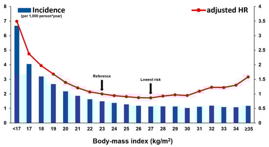 - Jee, S.H.; Sull, J.W.; Park, J.; Lee, S.-Y.; Ohrr, H.; Guallar, E.; Samet, J.M. Body-mass index and mortality in Korean men and women. N. Engl. J. Med. 2006, 355, 779–787. [Google Scholar] [CrossRef] [PubMed]