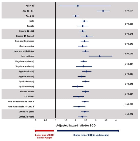 The impact of being underweight was analyzed in various subgroups. Being underweight was associated with significantly increased risk of SCD regardless of age, sex, income level, smoking history, alcohol consumption, regular physical activity, hypertension, dyslipidemia, fasting glucose, duration of DM, use of insulin, and number of oral antidiabetic medications (Figure 3 and Supplementary Table S2). However, significant interactions were observed with age, alcohol consumption, presence of dyslipidemia, and insulin use. People in the age range 40 ≤ age < 64 (adjusted-HR = 3.36; 95% CI = 3.06–3.70; p for interaction < 0.001), who were heavy-drinkers (adjusted-HR = 3.19; 95% CI = 2.67–3.82; p for interaction = 0.010), those without dyslipidemia (adjusted-HR = 2.50; 95% CI = 2.33–2.68; p for interaction = 0.015), and who were not on insulin therapy (adjusted-HR = 2.49; 95% CI = 2.32–2.67; p for interaction = 0.031) showed a stronger association between being underweight and SCD compared with their counterparts.