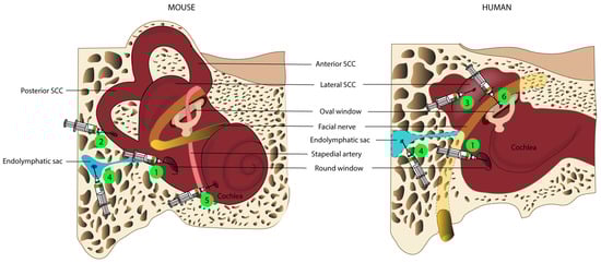 - Guo, J.; Liu, Y.; Qu, T.; Peng, Z.; Xie, J.; Wang, G.; Gong, S. Cochleovestibular Gene Transfer in Neonatal Mice by Canalostomy. Neuroreport 2017, 28, 682–688. [Google Scholar] [CrossRef]