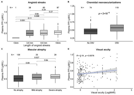 Correlation of plasma PPi and ophthalmological phenotypes. Plasma PPi is correlated with the presence of choroidal neovascularizations (B). Patients with severe macular atrophy have higher PPi than patients without macular atrophy (C), and worse visual acuity is weakly correlated with higher PPi (D). No significant correlation with the length of angioid streaks (A) was found. Data were analyzed with Student’s t-test (categorical variables) or the Pearson correlation (continuous variables). A p-value < 0.05 was regarded as statistically significant.
