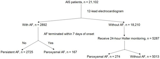 This is a retrospective case-control study. The study endpoints included paroxysmal and persistent AF. From January 2010 to September 2018, the data of 21,102 patients with AIS were recorded in the Chang Gung Research Database [12]; the largest multi-institutional repository of electronic medical records in Taiwan. The selection process with inclusion and exclusion criteria for patients with AIS is illustrated in Supplementary Figure S1. All enrolled patients underwent 12-lead electrocardiography (ECG). Among patients without AF on 12-lead ECG, only those receiving further 24 h Holter monitoring were included (Figure 1). Attending cardiologists interpreted the 12-lead ECG and 24 h Holter monitoring results. All patients underwent baseline 12-lead ECG and 24 h Holter monitoring during diagnostic workup in stroke unit.
