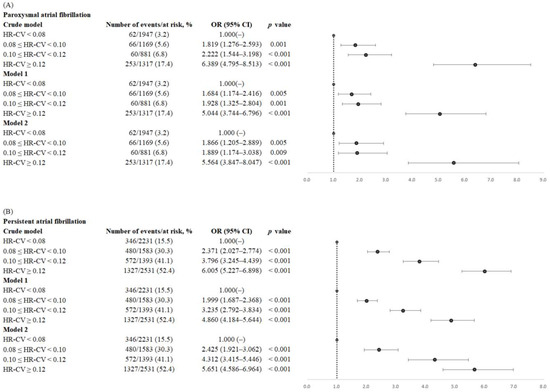 Forest plots of crude and adjusted ORs (95% CIs) of (A) paroxysmal atrial fibrillation and (B) persistent atrial fibrillation by HR-CV increments. The analyses were adjusted for age, sex, and eNIHSS score in model 1, as well as for all confounders considered in the fully adjusted model (model 2), namely age, sex, eNIHSS score, history of hypertension, diabetes mellitus, dyslipidemia, coronary artery disease, congestive heart failure, a history of cancer, smoking status, body mass index, total cholesterol, triglycerides, creatinine, alanine aminotransferase, mean heart rate, mean systolic blood pressure, and mean diastolic blood pressure. Abbreviations: OR, odds ratio; CI, confidence interval; HR-CV, coefficient of variation in HR; eNIHSS, estimated National Institutes of Health Scale.