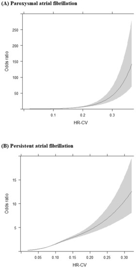 Even after multiple adjustments for potential confounders, no U-shaped curves were found for the associations of HR-CV with paroxysmal and persistent AF. Higher HR-CV levels were significantly and persistently associated with elevated ORs of paroxysmal and persistent AF (Figure 3).