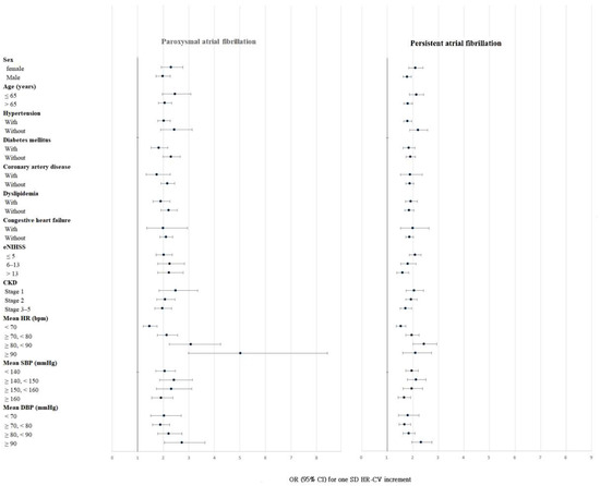 Subgroup analyses of paroxysmal and persistent atrial fibrillation per standard deviation of HR-CV increments. Abbreviations: HR-CV, coefficient of variation in heart rate; eNIHSS, estimated National Institutes of Health Stroke Scale; CKD, chronic kidney disease; HR, heart rate; SBP, systolic blood pressure; DBP, diastolic blood pressure; OR, odds ratio; CI, confidence interval; SD, standard deviation.