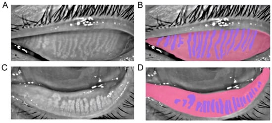 Dry eye disease (DED) is a prevalent and multifactorial ocular surface disease that causes various ocular symptoms and visual impairment []. It is characterized by disrupted tear film homeostasis, and the tear film instability is regarded as a significant entry point to the pathogenesis of DED vicious circle [,]. The tear film instability is frequently caused by a lack of lipids or abnormal quality of lipids secreted by meibomian glands []. Meibomian glands are located in the tarsal plates of the upper and lower eyelids with a tubulo-acinar structure, and their dysfunction commonly manifests as gland atrophy and loss []. Thus, the evaluation of meibomian gland morphology is essential in DED assessment.