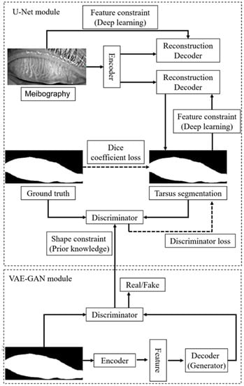 In recent years, artificial intelligence has been wildly applied in clinical diagnosis, examination recognition, and prognosis prediction []. Several studies have applied traditional artificial intelligence methods including edge detection and contour extraction, for meibomian gland segmentation and area calculation, and the algorithm achieved outstanding consistency with the manual label [,,]. However, these methods require complicated image preprocessing before the recognition and identification is affected by the image quality. Compared with the traditional method, deep learning (DL) models could learn the features automatically without manually defining them and have been shown to achieve excellent performance in various ophthalmological fields [,,]. Limited studies have attempted to apply a convolutional neural network to grade meibomian gland loss automatically [,]. However, these studies considered the inter-gland district as the meibomian gland area, so they might underestimate the loss area, and training lacks images with severe meibomian gland loss that would affect the generalization of the model. In Md et al.’s study, it is also proposed that an automatic meibomian gland segmentation system be based on deep learning. However, we applied a pre-trained VAE-GAN as a quality inspector, embedding the shape constraint information into the neural network to improve accuracy [].