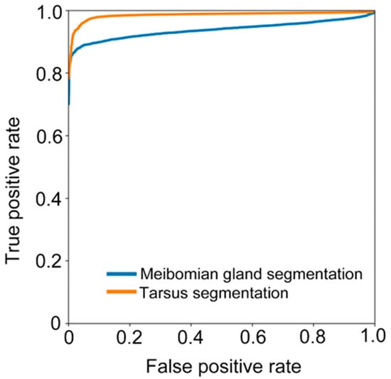 The receiver operative characteristic (ROC) curves for the models segmenting the tarsus and meibomian gland area.