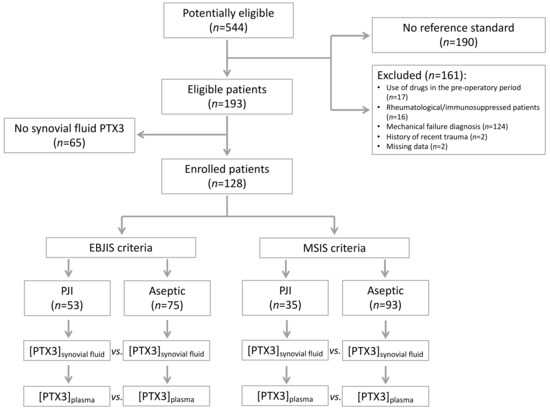 A limitation of the present study is that the reference standards used for diagnosis of PJI (MSIS and EBJIS criteria) did not include synovial alpha-defensin. In fact, our study was authorized and commenced prior to publication of the latest (alpha-defensin including) version of the EBJIS and ICM criteria. Consequently, we could not make any direct comparison between synovial alpha-defensin and PTX3 as for their diagnostic potential in PJI. Another limitation is that patients with clear or suspected auto-inflammatory conditions were excluded based on the reasoning that sterile activation of the immune system could have potentially resulted in elevation of the PTX3 levels in the synovial fluid and/or blood regardless of the presence of PJI. On the same line, patients undergoing prosthetic revision due to metallosis or severe wear of the polyethylene were not eligible. Further studies should be performed to investigate the diagnostic potential of PTX3 in these subgroups of patients.