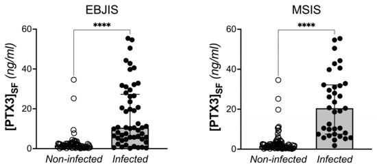 Concentration of PTX3 in the synovial fluid of THA and TKA patients with and without PJI, based on EBJIS and MSIS criteria (Mann-Withney test, **** p < 0.0001).