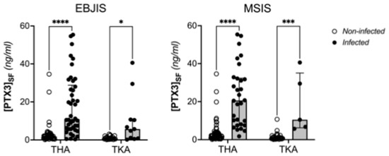 The following supporting information can be downloaded at: https://www.mdpi.com/article/10.3390/jcm12031055/s1, Figure S1: Concentration of PTX3 in the plasma of THA and TKA patients with and without PJI (based on EBJIS and MSIS criteria); Figure S2: Distribution and ROC curve of the concentration of CRP in the plasma of THA and TKA patients with and without PJI (according to MSIS criteria); Figure S3: ROC curves of the concentration of PTX3 in the plasma of THA and TKA patients with and without PJI (based on EBJIS and MSIS criteria); Figure S4: ROC curves of the concentration of PTX3 in the synovial fluid of patients with and without PJI according to surgery (THA or TKA) and EBJIS criteria; Figure S5: ROC curves of the concentration of PTX3 in the plasma of THA and TKA patients with and without PJI (based on EBJIS and MSIS criteria); Table S1: ROC curve analysis of synovial PTX3 in THA and TKA patients.
