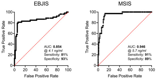 ROC curves of synovial and plasmatic PTX3 are shown in Figure 4 and Figure S5. For synovial PTX3, the best concentration values to discriminate between infected and aseptic patients was 4.1 ng/mL and 5.7 ng/mL for EBJIS and MSIS criteria, respectively.
