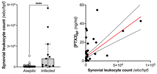 The leukocyte count in the synovial fluid was significantly higher in the infected revisions compared with aseptic revisions (p < 0.0001), according with the MSIS criteria. Moreover, the concentration of PTX3 was significantly correlated with leukocyte count in the synovial fluid.
