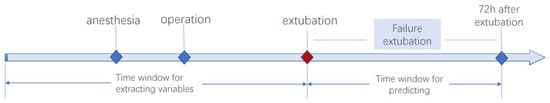 The time windows for the extraction of clinical variables were pre-anesthesia, intraoperative, and postoperative extubation. The time window of the prediction model was from the beginning of extubation to 72 h after extubation (Figure 2).
