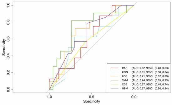 After training, the AUCs using RF, KNN, LOG, SVM, XGB, and GBM were 0.62 (95% CI, 0.40–0.83), 0.61 (95% CI, 0.38–0.84), 0.71 (95% CI, 0.52–0.89), 0.74 (95% CI, 0.55–0.93), 0.57 (95% CI, 0.40–0.74), and 0.67 (95% CI, 0.50–0.84), respectively.
