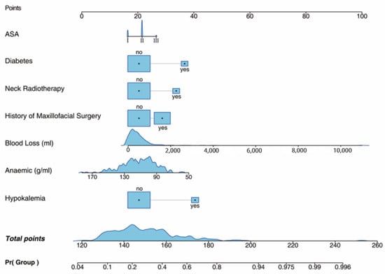 We used stepwise logistic regression to select seven key variables: ASA classification, diabetes, neck radiotherapy history, maxillofacial surgery history, intraoperative bleeding, anemia, and hypokalemia before extubation from 26 candidate variables for further study, as shown in Table S2.