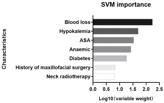 Finally, we screened out seven key variables to establish the model, and then analyzed and evaluated their risk level for extubation failure. Whether these key variables are appropriate for assessing the risk of postoperative extubation failure in patients with difficult airways, we found that most of them are in line with clinical practice and are supported by the literature. The first variable was the ASA classification, which is a commonly used clinical index to evaluate postoperative complications and anesthesia risk in patients and is widely used for risk prediction and many other purposes []. The second variable was a history of neck radiation. Radiation fibrosis syndrome is caused by radiotherapy of the head and neck; therefore, neck mobility and mouth opening are limited, which is related to the increased risk of difficult airways []. The third variable was a history of maxillofacial surgery. Changes in maxillofacial anatomy and defects in normal structures and tissues caused by maxillofacial surgery are also risk factors for a difficult airway []. The fourth and fifth variables were surgical blood loss and anemia before extubation. The maxillofacial surgical area was adjacent to the upper respiratory tract. Bleeding and swelling in the surgical area may increase the risk of airway obstruction, which is also an important factor for the increased risk of a difficult airway after head and neck surgery []. All of these five variables are directly related to the occurrence of a postoperative difficult airway. Thus, they are included in the prediction model by machine-learning.