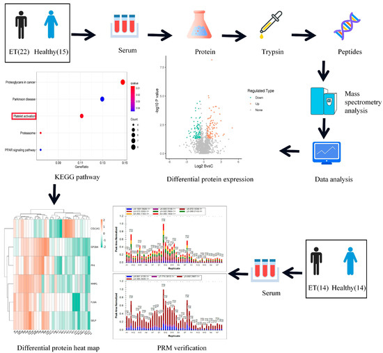 Sixty patients with ET who met the inclusion criteria and attended the Xiyuan Hospital outpatient clinic were chosen. Firstly, 22 were randomly chosen for LFQ proteomics testing, while 15 healthy individuals were also included. Then, we randomly selected 14 patients from 60 ET patients and 14 healthy individuals as controls and validated the LFQ proteomics results using parallel reaction monitoring technique (PRM). The PRM verification results were applied to the subsequent correlation analysis. Patients were rediagnosed and reclassified using the 2016 World Health Organization (WHO) [10] diagnostic and classification criteria at the time of their first visit to our institution.