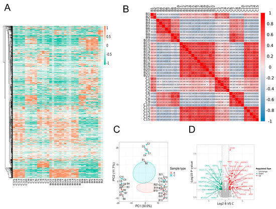 We used LFQ proteomics quantitative analysis to look at the serum protein levels of 22 ET patients (B) and 15 healthy people (C) to clarify the expression of proteins related to the platelet activation pathway. We then compared and analyzed the total and differential proteins in the disease and healthy groups. The results showed that platelet activation pathway−related proteins were abnormally highly expressed in ET patients, and the specific results are as follows: During this time, a total of 1890 qualifiable proteins and 1754 quantitative proteins were found by analyzing the protein profiles of the illness group and healthy subjects (Table 1). The heatmap visualized the whole proteome comparison between B and C, which indicated a significant change (Figure 2A). The correlation coefficient matrix shows the degree of intra−sample repeatability and inter−sample correlation, and the results indicate that the experimental results are good (Figure 2B). B and C were completely separated, as shown by the principal component analysis (PCA), and each group of samples showed well−clustering based on the first two principal components (Figure 2C). A volcano plot was applied to delineate the two groups’ proteins abundance against the corresponding p-value obtained from the t−test (Figure 2D).